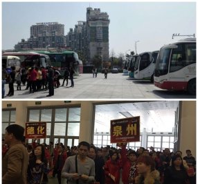 【圖為:超50輛大巴陸續把來自廈門及周邊地區的客戶朋友接待到場】