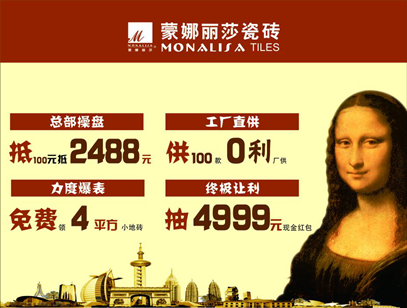 活動期間,進店預存100元誠意金,即可榮升蒙娜麗莎VIP俱樂部會員,憑VIP卡獲贈價值2488元大禮包一份,免費領取價值1288元4㎡小地磚 + 1200元蒙娜麗莎瓷磚抵用券,活動僅限前100戶業主。