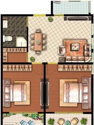 化解方法是:你這戶型不好做玄關(guān)或屏風(fēng)了,不過(guò)可以在進(jìn)門那面墻做一個(gè)鞋柜,旁邊種一棵闊葉的植物,如發(fā)財(cái)樹(shù)。至于臥室的床就按你圖上的擺法得了,床尾對(duì)窗風(fēng)水上并沒(méi)有什諱忌的說(shuō)法。你兩個(gè)臥室的門可以做對(duì)稱門,那樣將會(huì)是客廳的一個(gè)亮點(diǎn)。或者做成暗門的形式也是不錯(cuò)的。