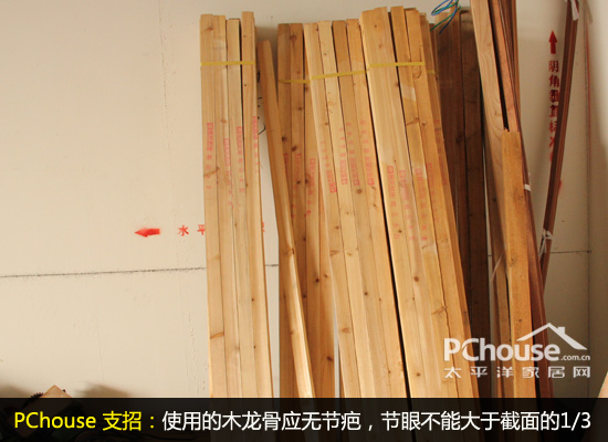 使用的木龍骨應無節疤,節眼不能大于截面的1/3。水平木龍骨截面尺寸應該達到要求,小面積吊頂25*30mm,大面積吊頂25*35mm。