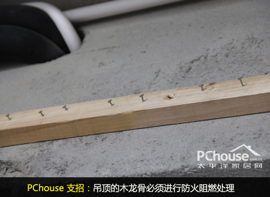 吊頂的木龍骨必須進行防火阻燃處理。應該在安裝前涂刷防火涂料,涂料必須滿涂覆蓋木質,眼觀無木質外露。涂料厚度、涂刷方法應符合相應涂料使用說明的要求。