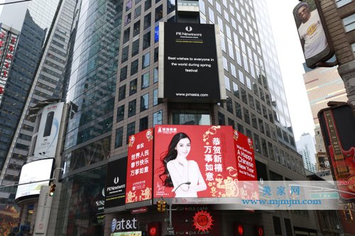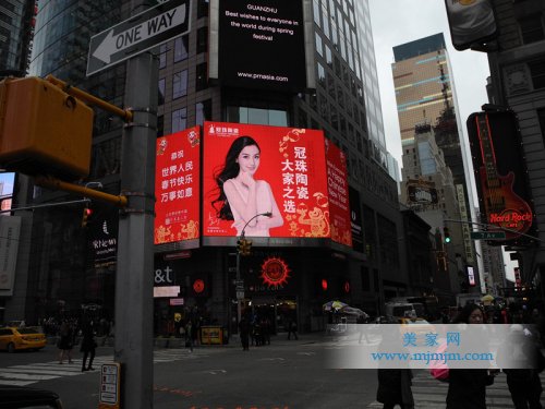 2016年2月7日,在這個舉家團圓的除夕夜:煙花夜空點綴,親情讓人迷醉;新春樂,爆竹炸掉煩惱,梅花綻放歡樂;新春喜,大紅燈籠掛起,春聯迎接福氣;新春歡,合家同享家宴,幸福享受團圓的夜晚,冠珠品牌攜手代言人Angelababy的賀年廣告強勢登陸紐約時代廣場,這幅來自中國陶瓷品牌廣告吸引了時代廣場路人的目光,也吸引了世界傳媒的關注。美國紐約時報廣場作為全球最受矚目的商業核心地段,已成為全球高端品牌展示的首選渠道,也成為中國卓越品牌走向世界的優質平臺。