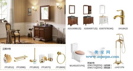 美式古典風的白金漢宮系列浴室柜搭配羅浮宮1842龍頭、漢斯4號古典五金件、奧斯卡1149坐便器、夢露8號浴缸以及羅浮宮2137落地浴缸龍頭,濃郁的美式古典氣質,簡潔而不失浪漫奢華。