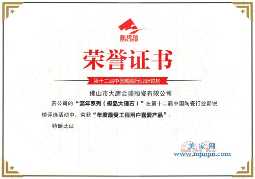 中國陶瓷行業新銳榜素有陶業“奧斯卡”之稱,一直堅持發現、傳遞新銳精神,弘揚創新理念,引領行業創新發展,這也是大唐合盛瓷磚的使命感和愿景。3月27日第十二屆中國陶瓷行業新銳榜揭榜,大唐合盛瓷磚的極品大理石瓷磚流年系列繼第十一屆新銳榜榮獲年度優秀產品之后,再奪“年度最受工程用戶喜愛產品”榮譽。