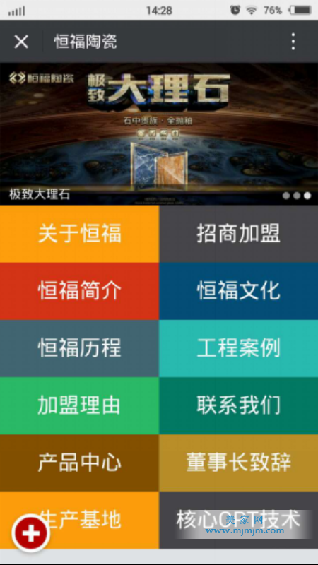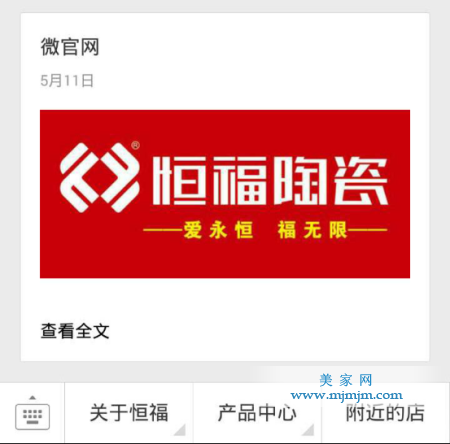 恒福微網站的上線,不僅對本品牌打造的意義重大,消費者只要關注恒福的微信號,就能瀏覽恒福的微網站,同時也是恒福在移動營銷方面的創新。恒福微網站的優勢:1、隨時隨地向消費者展示恒福陶瓷的影響力;2、附近的店功能,消費者可通過“附近的店”上的導航功能,快速找到當地的恒福專賣店;3、隨時隨地查看恒福各方面的詳細信息,方便快捷;4、貼心的導購功能,具有恒福全系列的產品及產品應用案例,方便選擇。