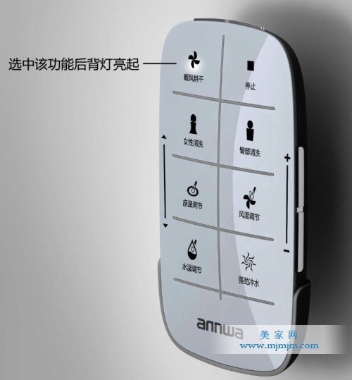 安華衛浴aB13017智能坐便器,隱藏式水箱,小巧精致,不會被母親嘮叨說占位置。專門設計的遙控器,按鍵涵蓋了智能馬桶全部的使用功能,超大按鍵尺寸,配上時尚簡潔的指示圖標,大字符中文說明,按鍵特設背光燈,選擇對應功能時按鍵背光燈亮起,更方便于老年人使用。側鍵可調節水溫風溫控制噴槍移動,位于頂部的開蓋按鍵方便遙控器掛墻上時可直接按壓。