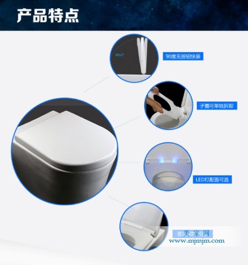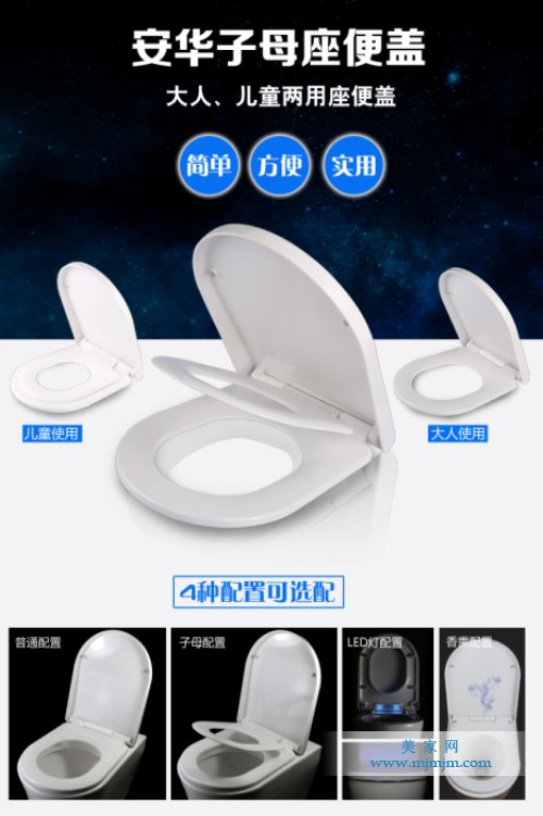 這一款安華衛浴新推出的子母坐便蓋,四種配置可選:成人座圈,兒童座圈,LED燈,香薰配置。整體坐便蓋采用90度無按鈕快裝設計,拆裝方便,子圈可以單獨拆裝,精心呵護家里的小孩。LED燈的配置讓您晚上如廁可以不必亮燈,不會擔心驚醒身邊的她。香薰配置能夠有效去除衛生間里的異味,還能滿足她對浪漫和品味生活的追求。