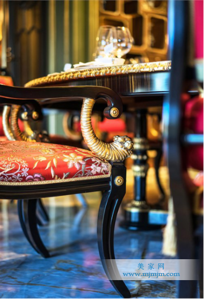 空間中最為典型的中國式形體表現為齊本德爾(Chippendale)式家具。如西餐宴會廳陳列柜,一眼望去充滿著強烈的中式符號表達,柜頂造型取自中國古建筑宮殿傳統的“廡殿頂”,而細節形態,包括鎏金裝飾卻又融進了歐式經典花紋的形體表現。柜中陳列的歐州古董器皿與中國青花瓷器一起演繹出那個繁盛的時代中西文化的碰撞與交融。