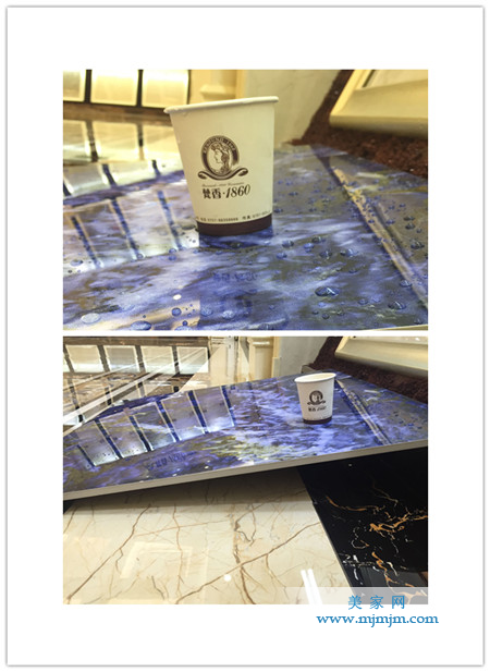 瓷磚的防滑性對(duì)于家居安全也是非常重要的。美家測(cè)評(píng)員在傾斜的瓷磚上灑滿水,然后在上面放一個(gè)裝滿水的杯子,觀察幾分鐘,發(fā)現(xiàn)杯子并沒有在瓷磚上出現(xiàn)滑行的現(xiàn)象。