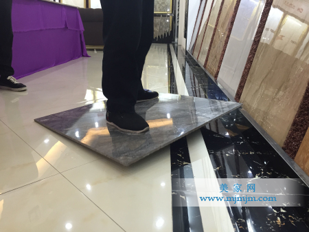 瓷磚的抗壓性指的是瓷磚的破壞程度。抗壓性能差,容易導致瓷磚在使用時出現開裂、斷裂等現象,也影響美觀。測評員先把瓷磚以單角獨撐的方式放置,然后我們找來了一位據他說有185斤的成年男士站上去,他還在上面不斷地搖晃,瓷磚也沒有出現開裂的現象。說明通體大理石瓷磚的抗壓性非常好。具有良好的物化性能;表面硬度大于5度;熱穩定性良好,即使180度高溫水冷循環3次,也無裂紋;強酸強堿浸泡24小時,磚面無侵蝕。