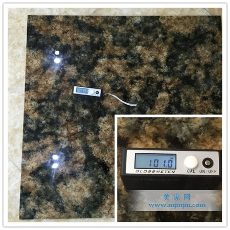 每塊瓷磚的光澤度都是不同的,美家測評員用光澤度儀器測試“黑瑪瑙”光澤度為101,光澤度真的是非常的驚人啊。小編在現(xiàn)場也能感受到這款磚真的是非常的亮啊。