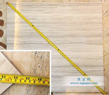 小編拿來卷尺測量了此款瓷磚的規格,測量結果:邊長800mm,對角線長113.1mm,與商家給出的尺寸相符。按照800mm*800mm的正方形計算,對角線應該是1131.3708mm。尺寸數據與實際測量數據相符,是一款規格正式的好產品。