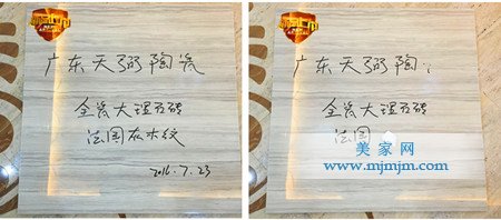 測試瓷磚的防污性,可以告訴我們瓷磚的好壞與否。防污性能好的瓷磚可以歷久常新,方便清潔,省時省力。美家網評測人員用水性筆在瓷磚表面寫上幾個字后靜置幾分鐘,再用紙巾拭擦瓷磚上面的污跡,結果污跡很輕松就被擦干凈,而瓷磚還是依然光潔如新。