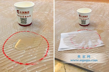 瓷磚的吸水性對于選購瓷磚來說是一個不能忽視的環節,一款不易吸水的瓷磚會更加防潮以及更加防止瓷磚的脫落。小編在瓷磚的胚體倒入水,觀察幾分鐘,發現水并沒有向圈外擴散的現象,稍等一會再放了張紙巾,此時圈內的水立即被紙巾洗掉,實驗證明這款法國灰木紋吸水率低,是一款不易吸水的瓷磚。
