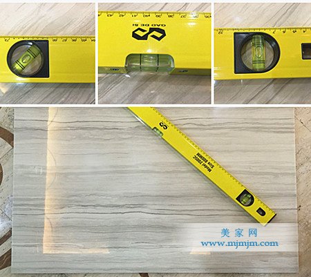 下面我們來看看這款大理石磚的平整性,小編把水平尺放在瓷磚表面,根據斜角放置的水平尺顯示,三個不同位置的水珠都處于平整狀態。結果說明了這款瓷磚的平整性能很好。