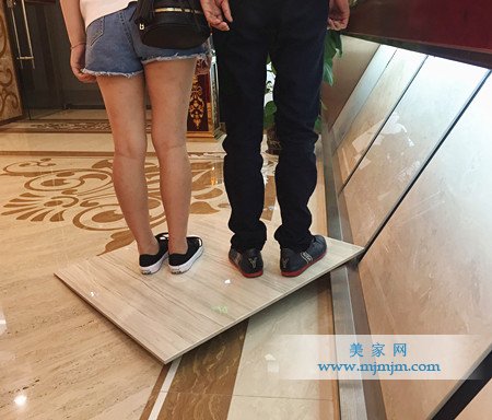 良好的抗壓性,能防止出現裂痕和容易受到較重的物品擊碎。對于選購家居使用的瓷磚也是非常重要的考慮因素之一。為此小編這次采用了比較特殊的方式來測試,測評員把瓷磚以單角獨撐的方式放置,并請現場的工作人員站上去,瓷磚沒有出現開裂的現象。說明這款瓷磚抗壓性還是經受得起考驗的。