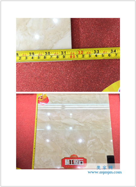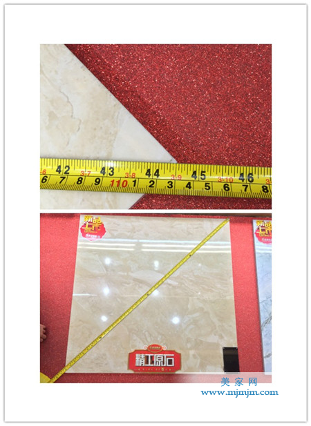 這款琥珀黃噴墨拋光磚據(jù)資料顯示規(guī)格為800*800,美家測評員用標準的卷尺量度瓷磚的規(guī)格,確實如資料所說,可見能強陶瓷對產品品質的精準把控。