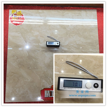 噴墨拋光磚具備和所有拋光磚類似的特點,玻化程度高、表面光亮、平整度也好,但是與傳統(tǒng)拋光磚不同的是噴墨拋光磚是以天然石材為藍本,除了紋理、花色比普通拋光磚更為細膩逼真,光澤度對應天然石材亮度,更具石材質感。能強陶瓷的琥珀黃噴墨拋光磚經美家測評員用光澤測試儀測定為70.1度,跟資料顯示的70度柔光吻合。