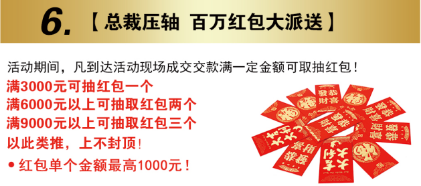 六、總裁壓軸,百萬紅包大派送:活動當天,凡購買滿一定的金額,最高1000元紅包等您來抽。
