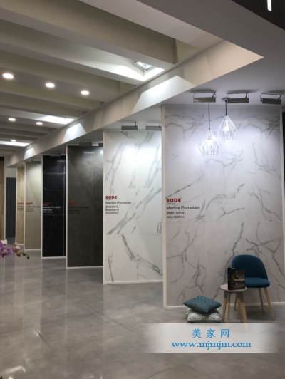 “為充分利用每一寸展位空間,對產(chǎn)品展示進(jìn)行聚焦,在布展方面花了不少心思。博德展位外立面是大豎版,各種色系均勻搭配,版面無縫拼接,將瓷石一石N面特色一覽無余;暖黃色仿古磚搭配冷色調(diào)的燈系,空間的明暗對比鮮明,仿古磚的歷史滄桑感,和木紋的清新現(xiàn)代相結(jié)合,具有豐富的視覺效果;黑色底紋配上白色LOGO,醒目而且亮眼;燈飾與品牌VI相一致,突顯對品牌的印象;寬松的過道與洽淡空間,有利于客戶溝通交流。”多次負(fù)責(zé)國際展會展位布置的國際事業(yè)部二部經(jīng)理李杰榮介紹到本次展位特點。