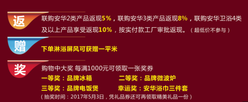 3、返:聯(lián)購安華2類產(chǎn)品返現(xiàn)5%,聯(lián)購安華3類產(chǎn)品返現(xiàn)8%,聯(lián)購安華衛(wèi)浴4類及以上產(chǎn)品享受返現(xiàn)10%,按實付款工廠審批返現(xiàn)。(超低價不參與)