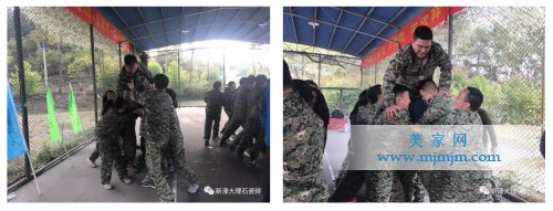 團(tuán)隊(duì)成員手搭著手、肩并著肩,形成一座穩(wěn)固的橋梁,讓隊(duì)員安全通過(guò)。
