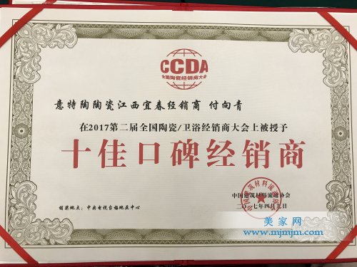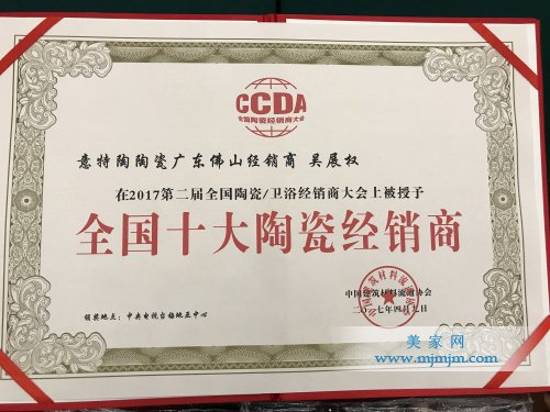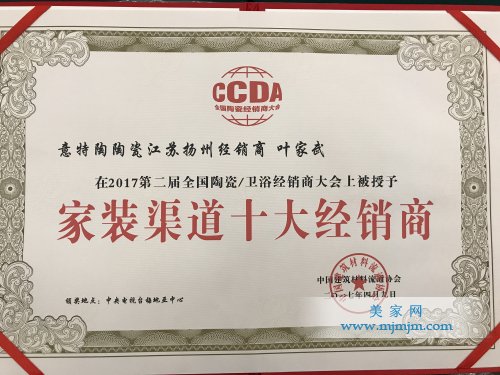 佛山意特陶陶瓷吳展權吳總,揚州意特陶陶瓷葉家武葉總,榆林意特陶陶瓷胡兵胡總以及宜春意特陶陶瓷付向青付總分別獲得全國十大陶瓷經銷商、中國陶瓷行業家裝渠道十大經銷商、中國陶瓷行業誠實守信經銷商和中國陶瓷行業十佳口碑經銷商稱號。