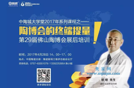 展會前后,組委會特邀建材行業(yè)專業(yè)營銷咨詢機構(gòu)的首席培訓(xùn)導(dǎo)師鄧煜先生于3月24日(主題:展會前后招商新模式)以及4月28日(主題:第29屆佛山陶博會后的終端提量)對參展商進行培訓(xùn),助力企業(yè)提升銷售業(yè)績。