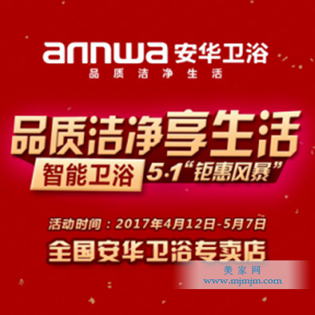 五一黃金周,正值家居裝修黃金季節(jié),為回饋廣大客戶一直以來的支持和厚愛,安華衛(wèi)浴以“品質·潔凈·享生活”為主題在全國范圍內(nèi)開展大型讓利活動,活動時間:4月12日——5月7日;顒悠陂g,不僅智能衛(wèi)浴新品及系列優(yōu)惠套餐以驚爆低價感恩回饋廣大消費者,還有更多超值豪禮狂歡大放送!