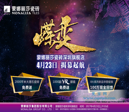 2017年4月2日-23日深圳福田區八卦四路2000㎡蒙娜麗莎瓷磚旗艦店蝶變起航,值此展廳重裝試業之際,深圳蒙娜麗莎瓷磚廣邀新老客戶各界同仁參觀指導。在試業期間凡報名參加即可獲贈品牌VR眼鏡一副,沉浸式VR家裝體驗。下訂金滿1000元即可獲贈5㎡大理石瓷磚!精明的你不容錯過。