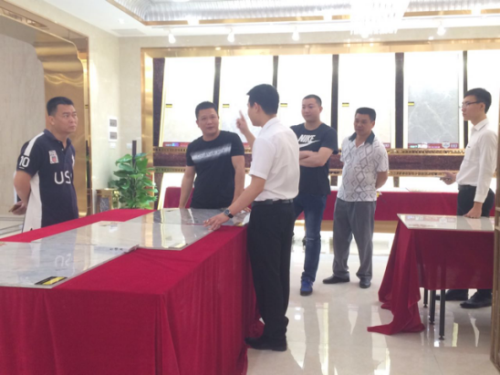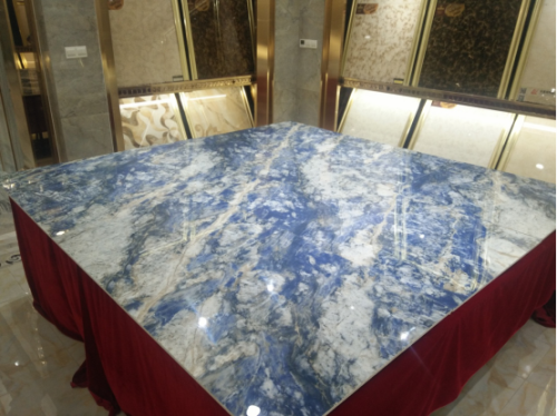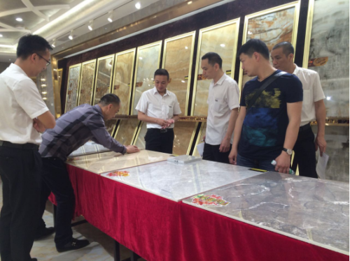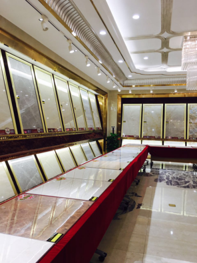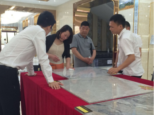 現場展示的新品之一——通體大理石瓷磚從技術、效果、紋理等方面全方位突破,跨越底坯發色的瓶頸,實現了瓷磚表里如一的特點,得到了一致的認可。