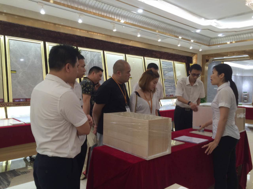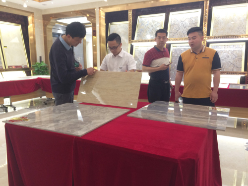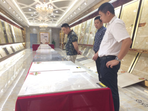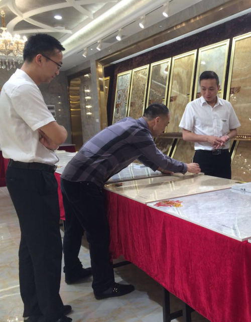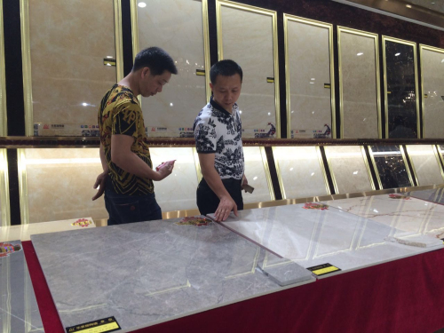 ▲ 經(jīng)銷商親自就極簡大理石瓷磚和原石進行比對