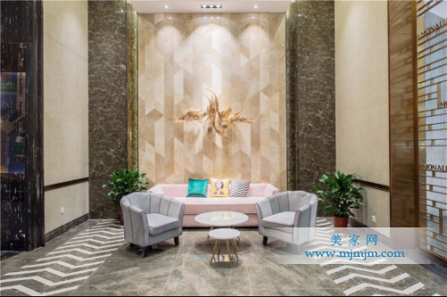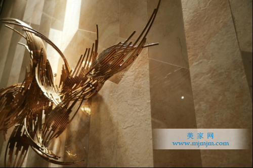 ▲羅馬御石亮光面、綢光面、自然面三種釉面混搭應用,搭配拉絲香檳金藝術品,使得原本沉悶的背景墻一下子充滿了奇妙的視覺效果。