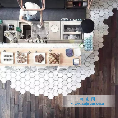 ▲幾何元素表現的是數學的美,永不落俗,是最純粹的裝飾動機。六邊形磚半鋪貼的做法既凸顯了廚房地面的造型感,又通過兩種材質間的承接過渡增加了層次感。