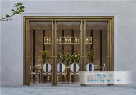 三開式黃銅色大門使餐廳入戶端景,聚焦藝術性與皇家氣質的視覺。運用中國傳統繪畫中屏條形式,11塊頂天立地的大屏條與天花結合,勾勒出大氣的餐廳氛圍。
