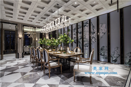 摩登東方的概念既可以運用東方元素,也不拒絕西方審美。設計師用水墨圖案來呈現空間的藝術感,用云紋大理石與黑檀木來體現空間的貴氣,用花鳥和龍紋來呼應北京皇城的姿態。