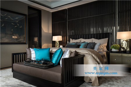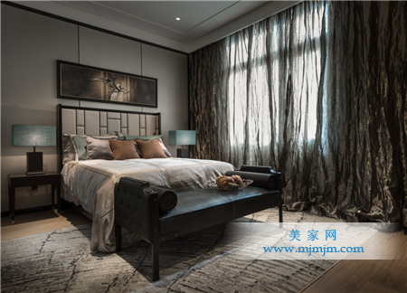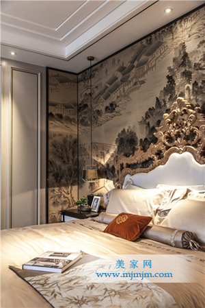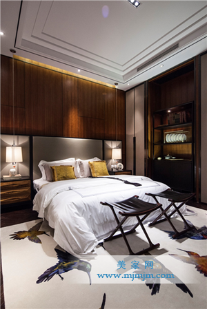 龍最能代表京城文化,在軟裝陳設方案中選擇了有龍圖案的布藝做點綴,抱枕上是手工縫制的金龍,主臥室前廳、吧臺、影視廳搭配龍紋地毯。