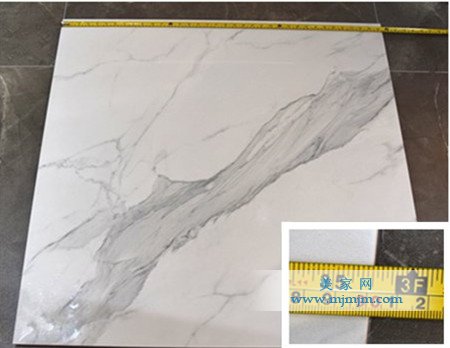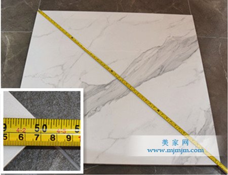 在測評現場,測試這款魚肚白尺寸是900mmX900mm的方形瓷磚,小編使用標準尺子量度,得出結果是長900mm*寬900mm,對角線為1272mm。 通過對瓷磚的測量,尺寸數據與實際測量數據準確無誤,做工與規格精準、分毫不差,是一款規格標準的好產品。
