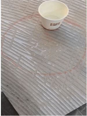 小編在瓷磚的胚體上畫了一個紅色的圈,并將水倒入圈中,觀察幾分鐘后,發現水并沒有向圈外擴散的現象。隨后,小編在水上放入了一張紙巾,此時圈內的水立即被紙巾吸收掉。實驗證明,這款魚肚白大理石瓷磚吸水率極低,不易吸水。