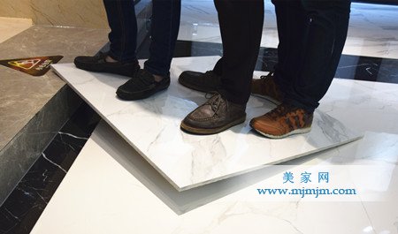 抗壓性能是瓷磚質量的重要指標。若達不到國家標準的要求,會影響瓷磚的抗壓能力,使用過程中會造成瓷磚的開裂、斷裂,影響使用。為此小編這次采用了比較特殊的方式來測試,測評員把瓷磚以單角獨撐的方式放置,并請現場的3位稍健碩的工作人員站上去,瓷磚沒有出現開裂的現象。說明這款瓷磚抗壓性非常好,即便獨角支撐也能通過考驗。