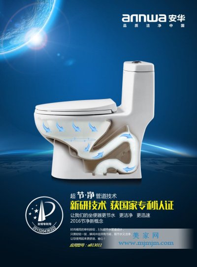 獲國(guó)家專利認(rèn)證的安華“超節(jié)凈”管道技術(shù),實(shí)現(xiàn)雙水封、雙虹吸力,通過(guò)優(yōu)化特殊單管道管徑設(shè)計(jì),沖力更強(qiáng)勁,更少的用水量就能一次沖凈污物。