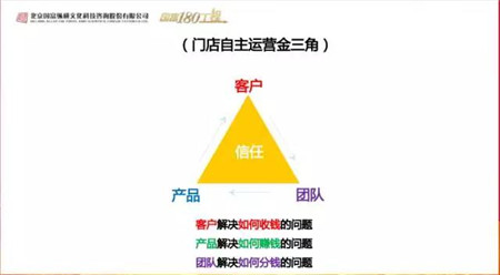 ●從理論到實際營銷的環節自始而終靠的是門店自主運營金三角“客戶、產品、團隊”;