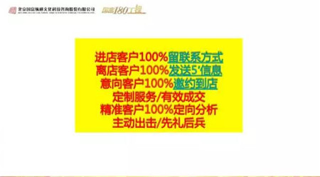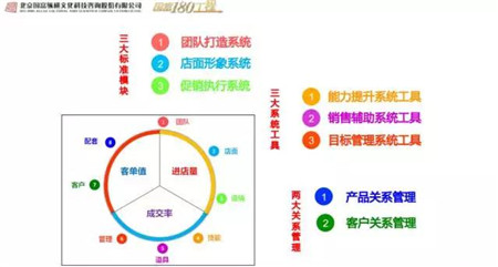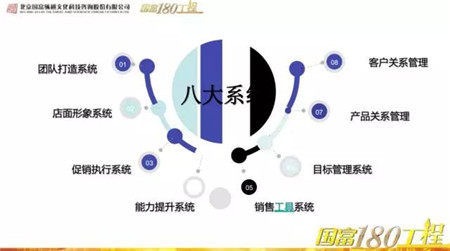 ●離不開八個系統:團隊打造系統、店面形象系統、促銷招待系統、能力提升系統、銷售輔助系統、目標管理系統、客戶關系管理、產品關系管理。從而解決提升終端門戶進店率和客流量。