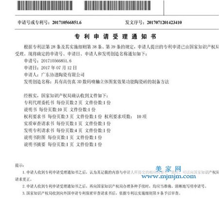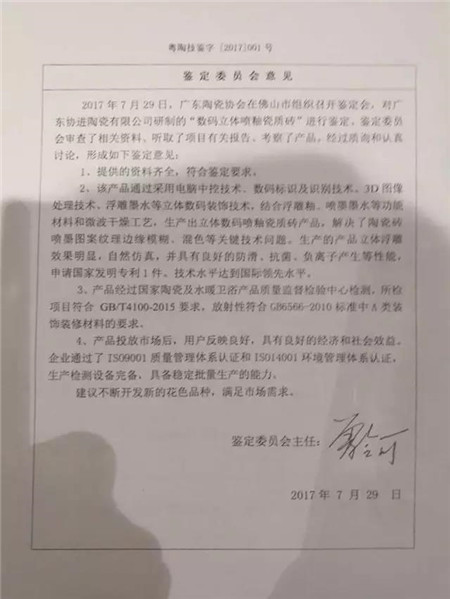 2017年7月29日上午10時,廣東恊進陶瓷有限公司珈納品牌摩卡館內(nèi),對公司研制的“數(shù)碼立體噴釉瓷質(zhì)磚”產(chǎn)品進行鑒定。本次鑒定會特邀廣東陶瓷協(xié)會多名專家到場,對高仿真3D數(shù)碼噴釉功能立體圖案效果陶瓷磚及其制備方法進行公開展示,并進行學術(shù)報告。