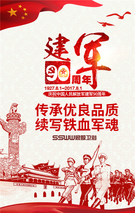 今年,是中國解放軍建軍九十周年,在這個特殊的日子,中國解放軍首次舉行以慶祝建軍節為主題的專項閱兵,向世界展現中國軍隊的強軍成果。浪鯨衛浴為人民解放軍送上祝福,祝賀中國解放軍建軍九十周年。