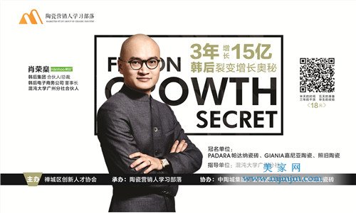 2017年8月12日,由禪城區(qū)創(chuàng)新人才協(xié)會主辦,陶瓷營銷人學習部落承辦,臥龍咨詢、中陶城集團、PADARA瓷磚聯(lián)合協(xié)辦,PADARA瓷磚、GIANIA嘉尼亞陶瓷、照舊陶瓷冠名贊助、混沌研習社廣州分社全程支持,特別邀請韓后總裁肖榮燊先生進行《3年增長15億——韓后裂變增長奧秘》主題分享會將在佛山陶瓷總部基地劇場隆重舉行。
