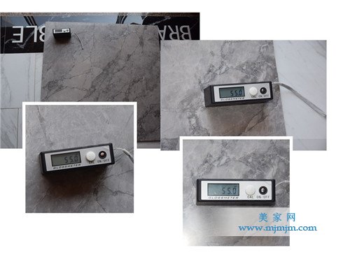 光澤度的測評,小編把瓷磚插干凈后,把測光澤度的儀器放在特拉斯灰的不同位置,發(fā)現測度器的幾個位置的讀數均為55度。而這款瓷磚也標明了光澤度,與實際無差別。這款瓷磚與石材天然的光澤度相吻合。