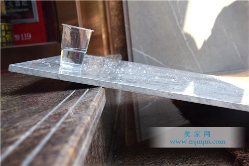消費者對瓷磚的防滑性能自然會被關注。測評人員先找了個角度,放上瓷磚,在瓷磚上灑滿水。水珠清晰可見,然后放上一只水杯。水杯靜置且不滑落。家居瓷磚對防滑性的要求,這款特斯拉灰一定合格。
