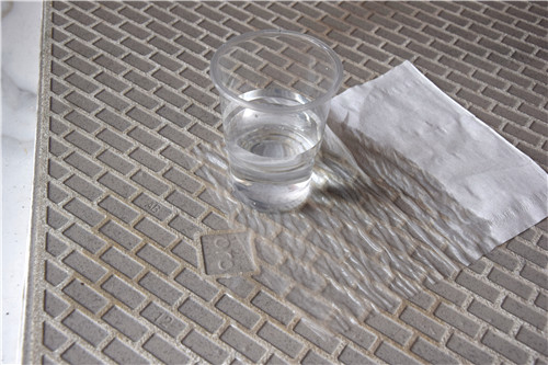 在觀察中我們發(fā)現,水團在瓷磚背面無流動、無分散,依然保持成形,一如最初所呈現的模樣。然后再放了張紙巾,此時圈內的水立即被紙巾吸掉。由此可證明,該產品具有致密度高、吸水率低的性能優(yōu)勢,生產制作質量極佳。
