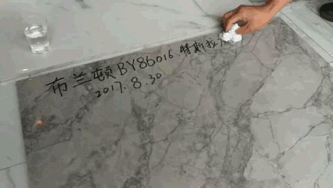 瓷磚的防污性也是日常關注之一。測試人員用一只大頭筆寫下名字,靜置5分鐘,用紙巾擦拭,即可看見筆跡消失,體現的特斯拉灰的防污性表現極好。